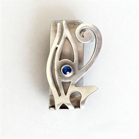 This piece features the Eye of Horus, hand-cut from 925 sterling silver, with an inlaid sapphire at its core. Each one is cut, filed, and finished by hand in Abu Dhabi. No two are the same.